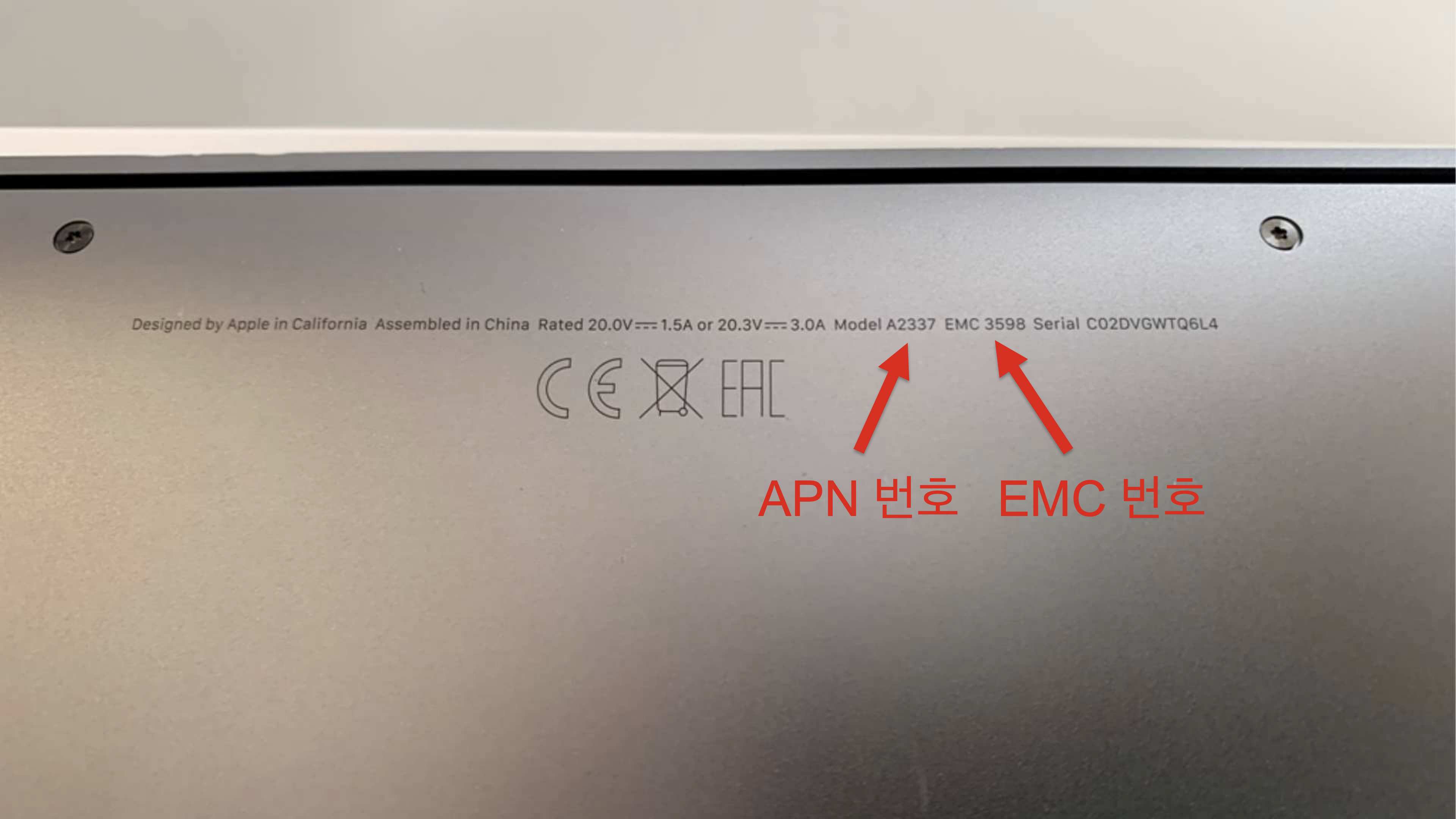 맥북은 모델별 가격이 상이하니 아래와 같이 맥북 하단에 있는 APN과 EMC를 확인하여 금액을 확인해주시기 바랍니다